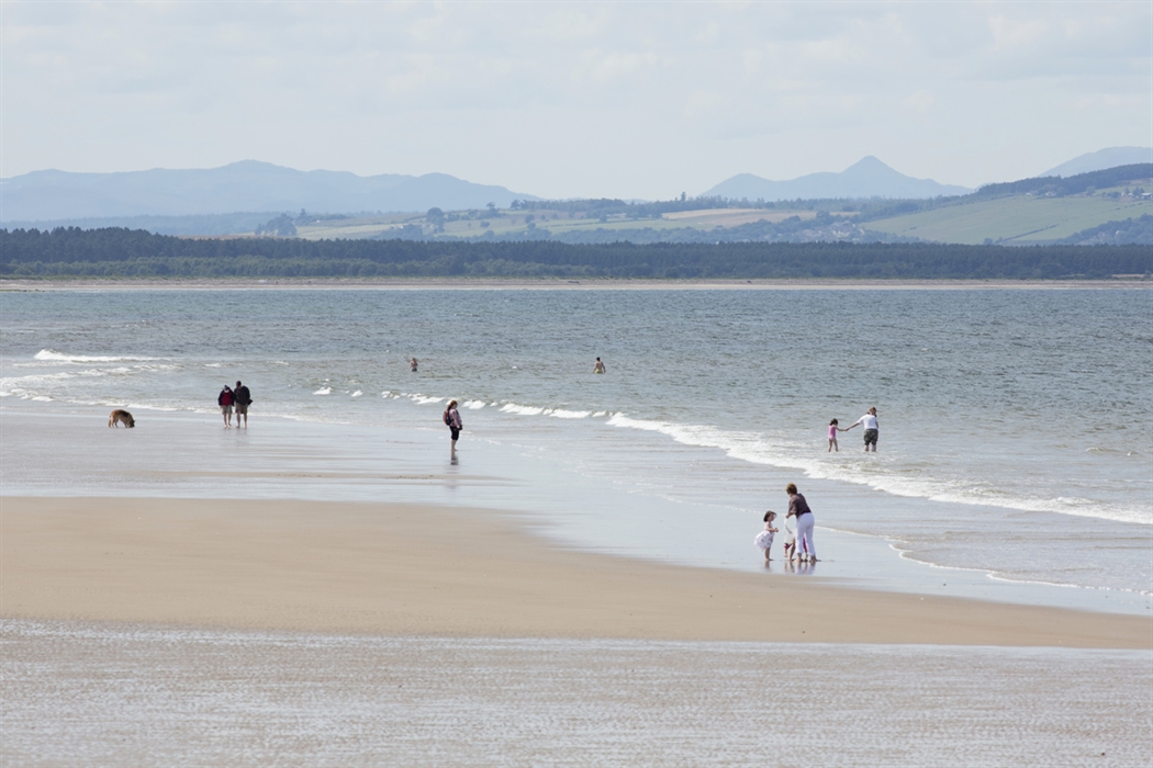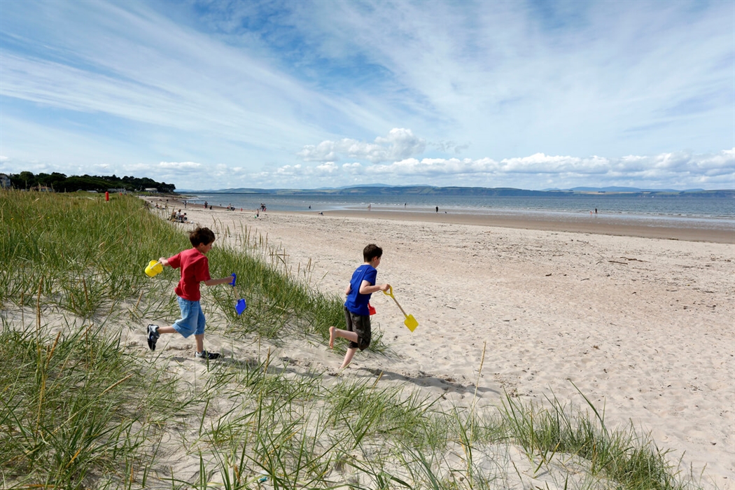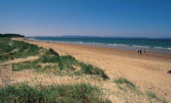 Nairn Beach is backed by low sand dunes and a promenade with an open, grassy links area.
