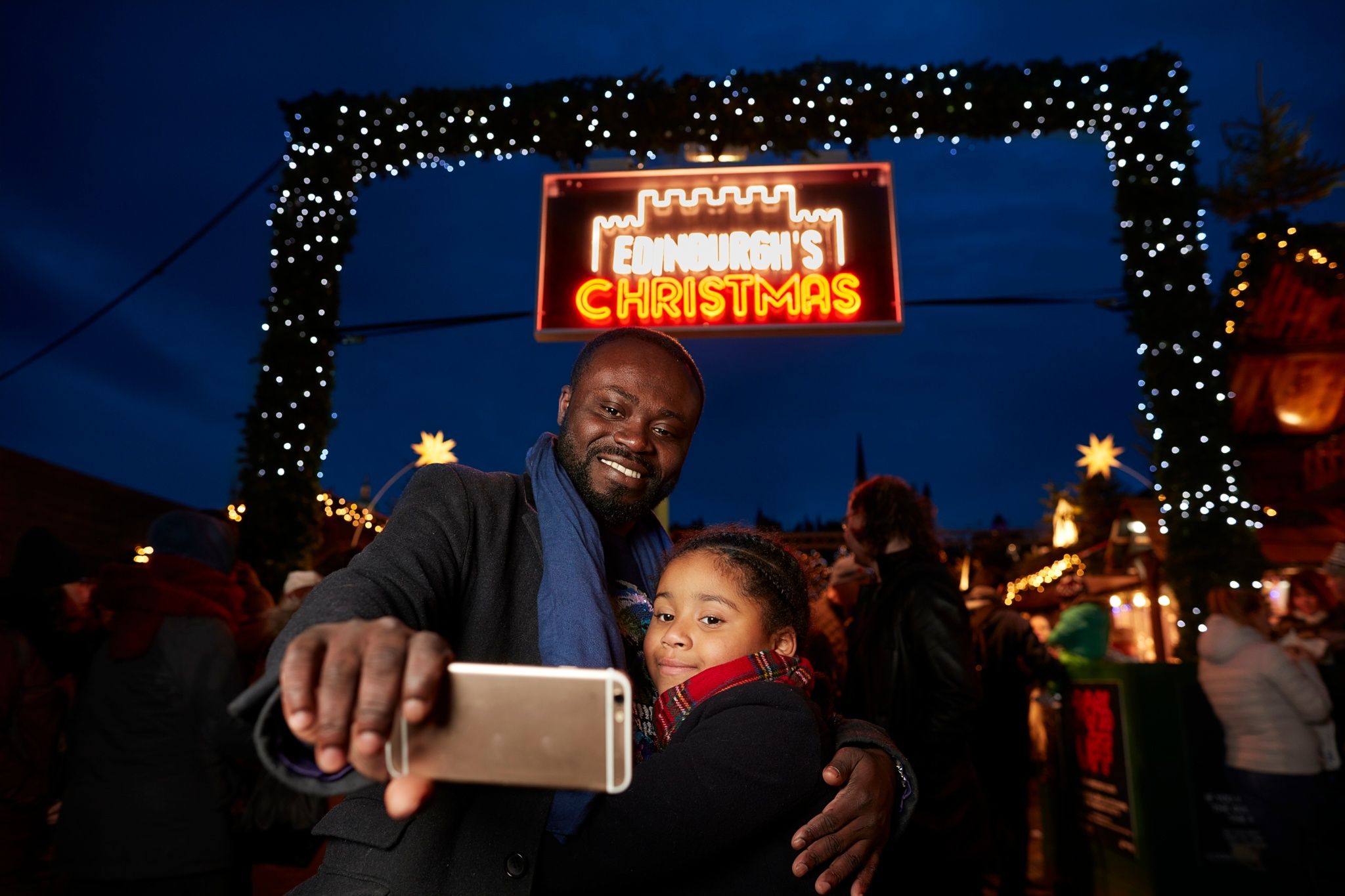 A father and his daughter enjoying the Edinburgh Christmas Market.