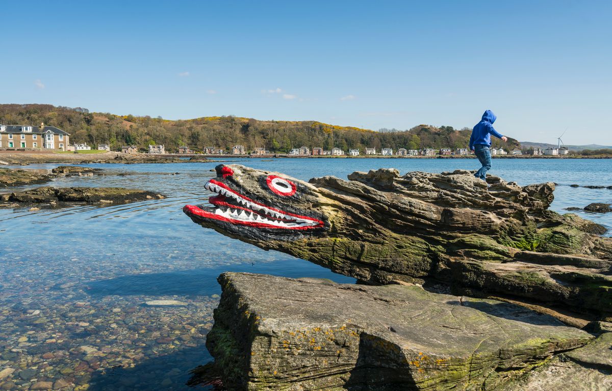 A child walks on Crocodile Rock on the beach in Millport, Cumbrae