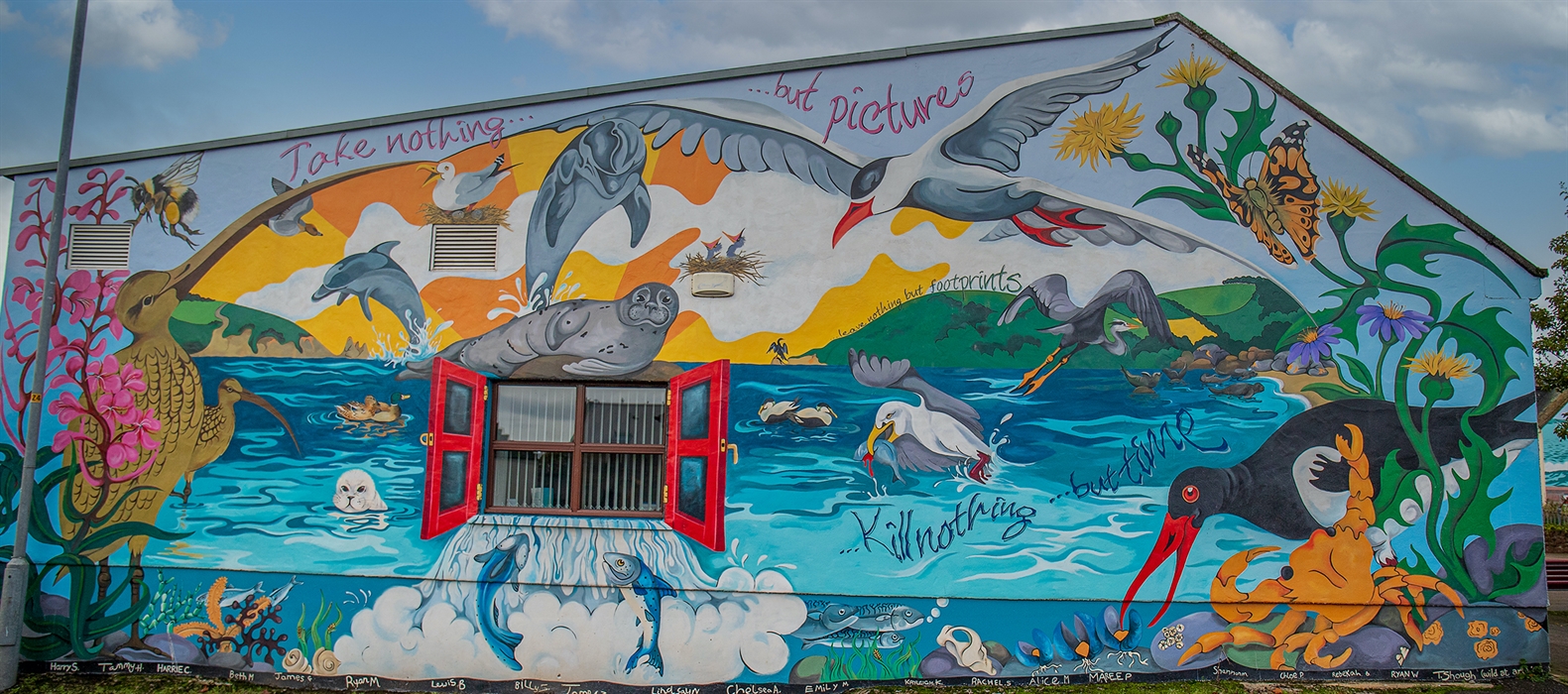 Invergordon in Sutherland is a former naval base and stopping point for cruise passengers coming into the Highlands. The town has become an outdoor art gallery thanks to a local collective called Invergordon Off the wall. On the side of several buildings you'll find large bright murals illustrating the social and industrial heritage of Invergordon.